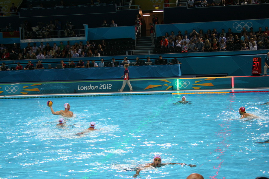 We head into the water polo, fab seats only 3 rows back.